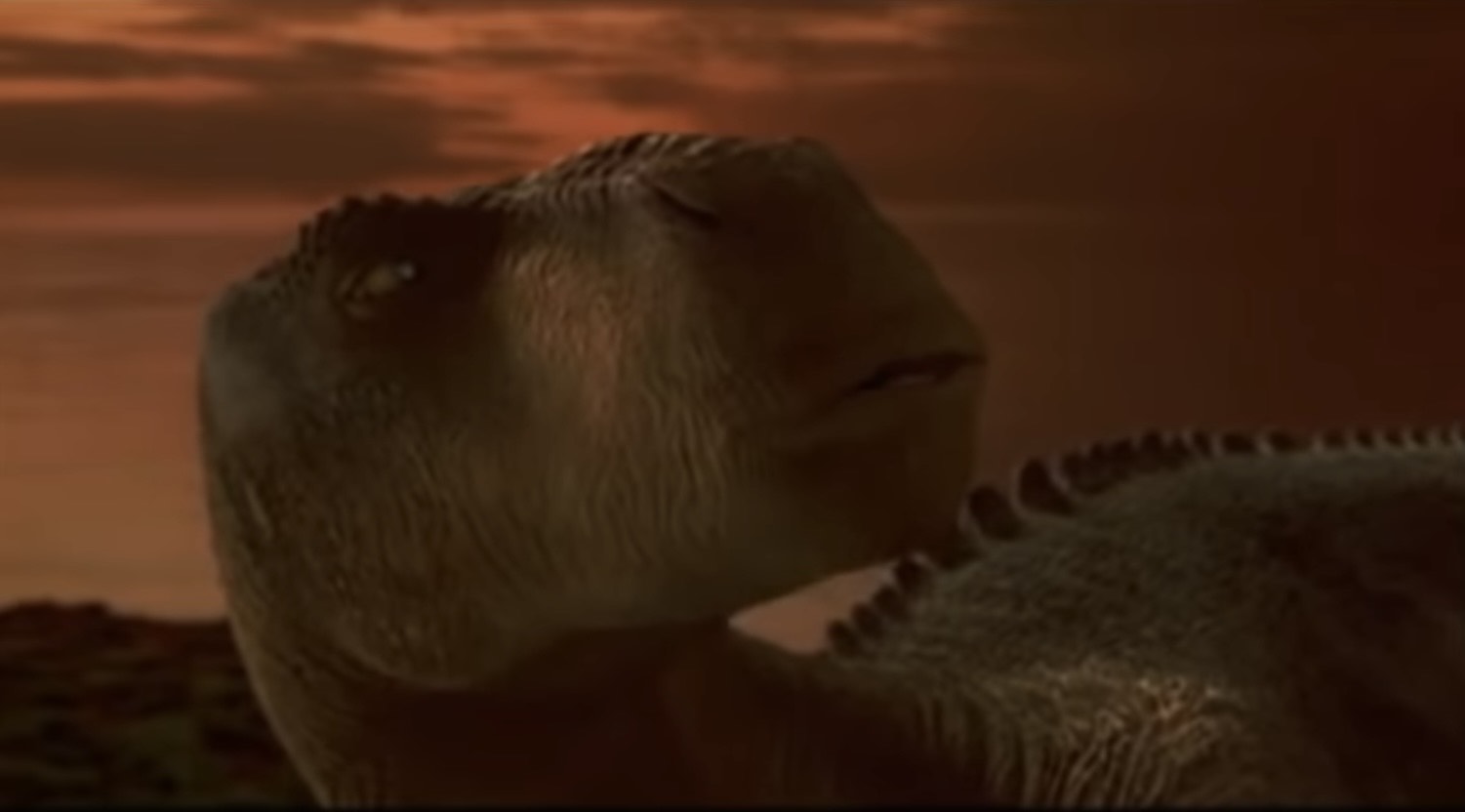 Disney films often have romances that more or less come out of left field. There may be a meet cute but rarely anything gets built up. And this is no different. To make things complicated though she’s the sister of the leader of the herd who has taken an instant disliking to Aladar. Neera initially thinks Aladar is a bit of a jerk but clearly warms up to him by the time her brother croaks. Of note is that Neera is an iguanodon like Aladar while Kron is an altirhinus. They never explain how they are connected though one could assume they stumbled together in a fashion to Aladar and the lemurs.