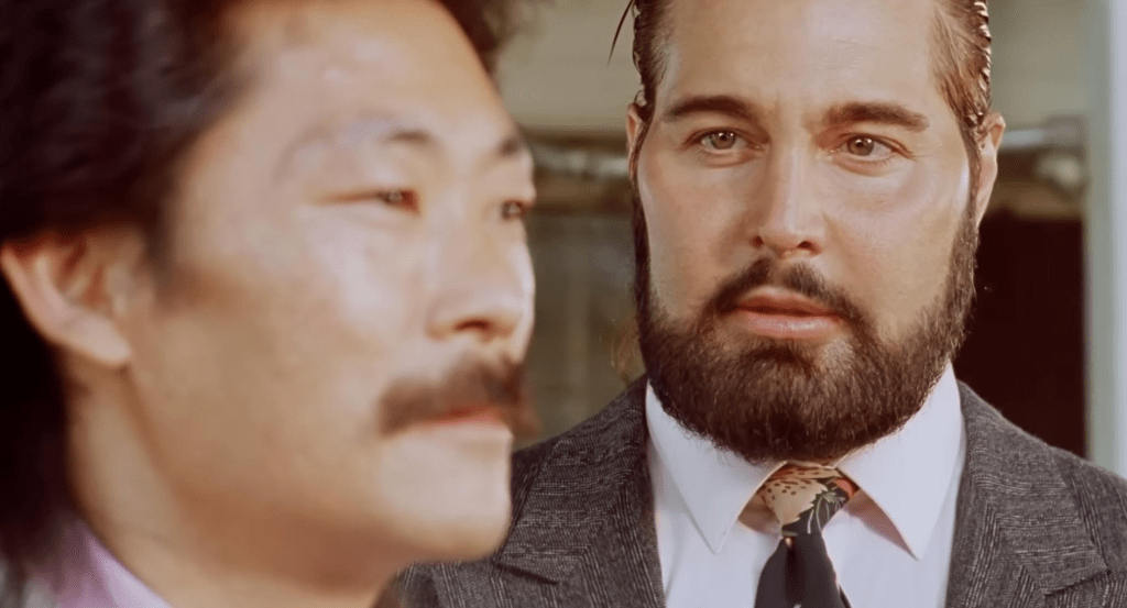 Fuj Fujiyama (Cranston Komuro) and Yamashita (Robert Z’Dar) along with a redheaded woman (Cameron) that is never named but consistently present are our villains. Is she a high-ranking member of the Katana Drug Syndicate or Yamashita’s henchwoman? Depends on the needs of the scene though the biggest issue is that this woman who is important to the story never gets a name. Maybe that is why she never came under the sway of Joe’s manliness.
