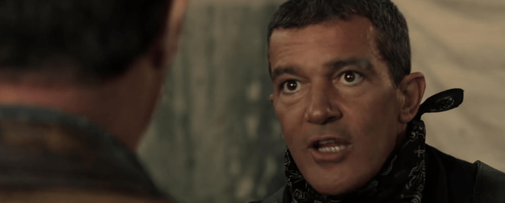 Antonio Banderas as Galgo starts out looking like strictly comic relief (and he is that for much of the movie) but grows more complex. It is said he was kicked out of his squad-whose members he talks about often-but if you pay attention you pick up that he is talking about dead men and he is the only survivor. He cannot quite accept he is the lone survivor and his incessant talking about them makes people believe he was sent away. It is a bit heartbreaking.
