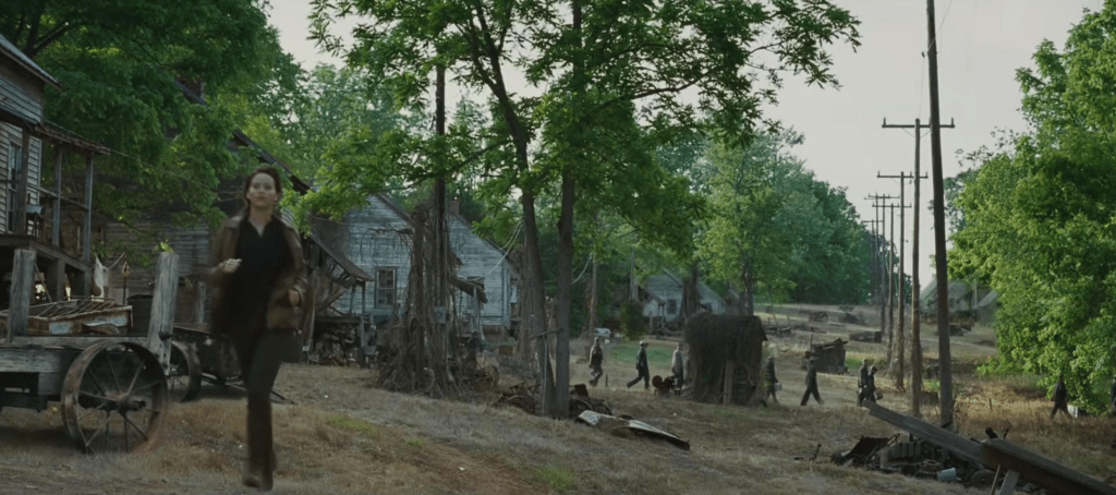 While Ross and company do generally create a very believable environment the one thing that consistently bothers me is Katniss’s jacket. District 12 looks like the most rural of rural areas that is suffering from poverty and starvation, yet she is the ONLY ONE zipping about in a nice leather jacket. It just really stands out to me in a poverty-stricken area.