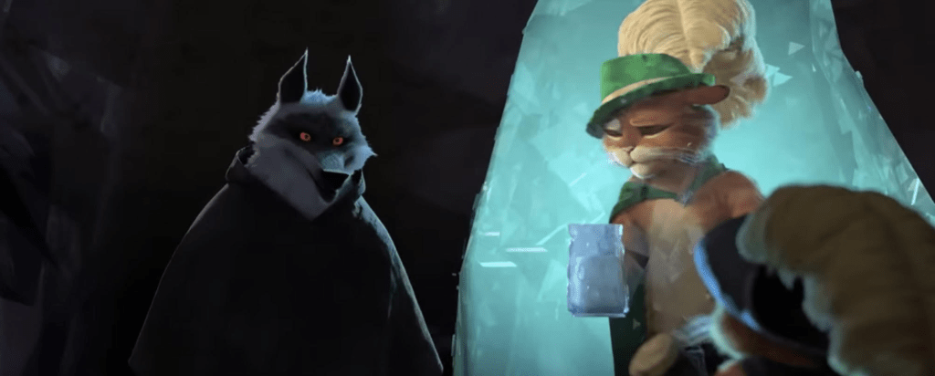 Hot on Puss’s heels is what looks like the Big Bad Wolf but is actually Death who Puss initially mistakes for a bounty hunter. Puss for his part at the end of his life right now, and simply resigns himself to his fate which is moving in with crazy cat lady Mama Luna. Puss is eventually motivated in his actions by a fear of death before he can fix what he regrets!