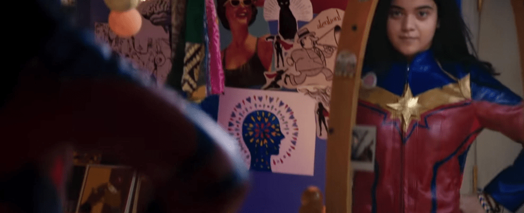Ms. Marvel opens with an animated montage of hero worship involving Carol Danvers by the title character Kamala Khan (Iman Vellani). Kamala worships Carol Danvers based on…? Seriously what exactly? Based on the films to date her exploits in the 90s were not publicized and beyond Endgame which she got essentially punched out of as I recall she has done nothing that the general public would be aware of. So why does Kamala have this obsessive level of idolatry?
