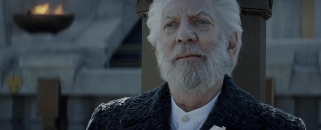 One would think that having a talk between two rivals rather than a bloody destructive fight would be anticlimactic yet it is not when Snow and Katniss finally face each other. It is a great payoff as the two finally meet in his enclosed flower garden. Snow even finds a measure of victory in that he sees Katniss as having been used by Coin since it was Coin that dropped the bombs on the children which in turn caused support for Snow to evaporate. He revels in her trading one Snow for another.