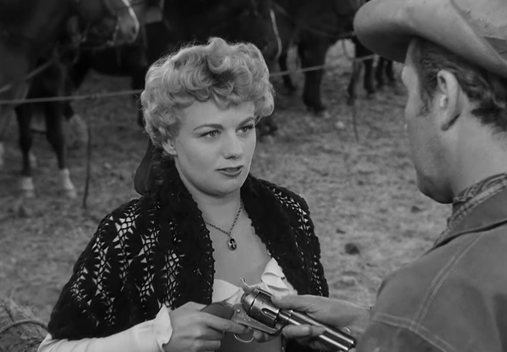 Sometimes a movie comes along and not only is it great, but it also changes a career. Winchester ’73 is credited with establishing a new screen persona for the talented and clearly versatile Stewart. He was much more violent and disillusioned as the central character of Lin McAdam yet still likeable. McAdam is cold and often determined yet with a moral compass which gives him a sense of right and wrong and also puts them in connection with Lola Manners (Shelley Winters).