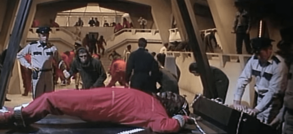 I understand the scenes with the ape conditioning were there to drive home the brutal conditions the apes were experiencing. You need to see how tormented they were. None of it had the veneer of plausibility though. It looked like straight up torture and not training. Director J. Lee Thompson did not even try to make it look they were (poorly) training them. It is just a heavy-handed way to make a point.