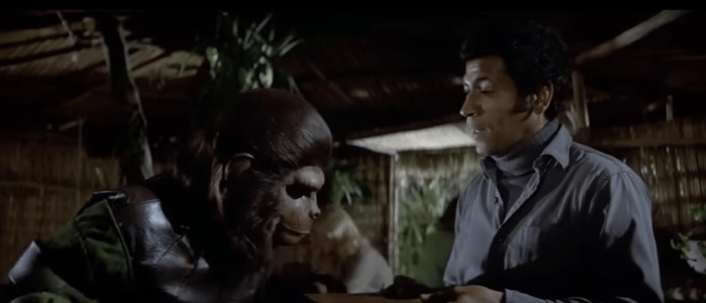 McDonald 2.0 (Austin Stoker) takes on a pretty prominent role here. Almost equal to that in my opinion of Caesar or other ape characters. For somebody who’s a member of the oppressed class he certainly has a lot of personal freedom. In fact he’s practically an ape character.