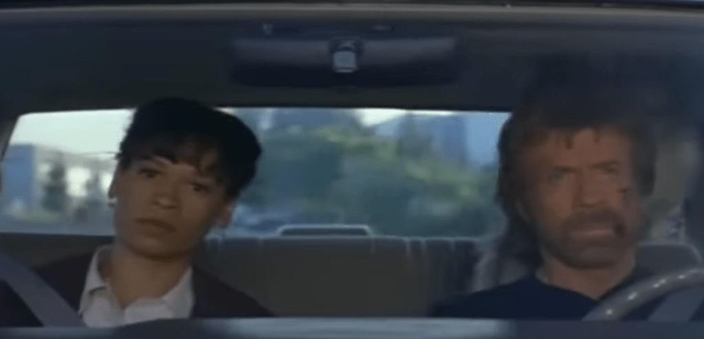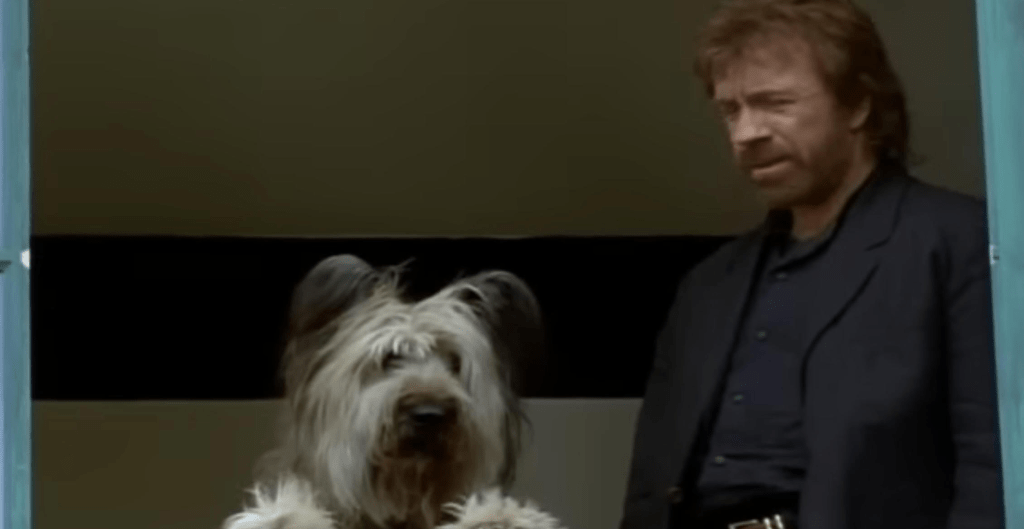This is a movie where with a series of spin kicks a dog named Reno (Digby and Betty) and his sidekick cop Jake (Chuck Norris) end racism not only in America but throughout the world. Or sure seems like it by the way they talk up the threat. One thing that struck me is that it’s strongly implied that there is some network of racist terrorist groups fomenting racism and racist attacks throughout the world. This movie is about 30 years old and that sounds like an idea fresh from today.