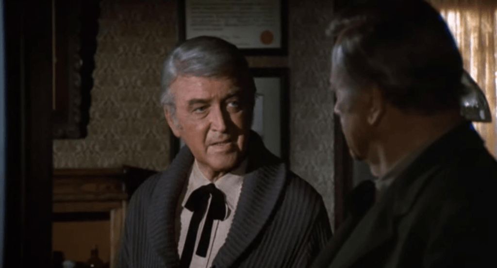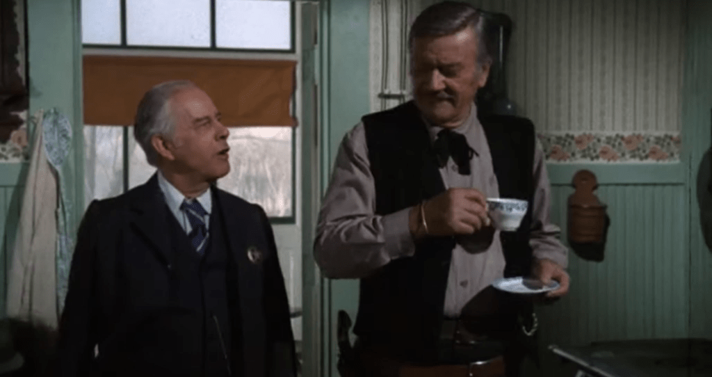 One of the things mentioned often is that the pain of Books’s cancer will increase. Wayne never contorts in pain or winces overtly obvious on screen but there are points where he’s either breathless or takes swigs from the bottle of laudanum given to him by his friend and physician Doc Hostetler (James Stewart). His situation is far worse than he is letting on and Wayne lets the observing audience know but does not handfeed it to the characters in the film.