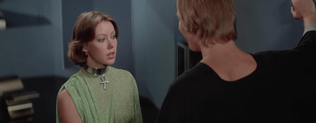 Accompanying Logan on his trip is Jessica 6 (Jenny Agutter) who he meets when flipping through options for an evening’s boinking. He rightly assumes she is connected to an underground railroad that helps get people to Sanctuary as she wears an ankh which he found on a retired (executed) runner earlier in the film. Unlike Logan or others in her society, she is not blindly pleasure seeking and even refuses sex when Logan asks for it.