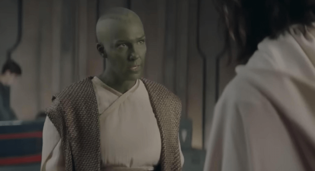 “Attack me with all your strength.” Even in a fictional universe like Star Wars with some of its dialogue that’s still rather awkward and generally unnatural. And how does the evil twin Mae (Amandla Stenberg) so effortlessly sneak into the Jedi temple on Olega? Jedi have a level of extrasensory perception but Mae is able to sneak around as if they are all regular people. And no security measures to be safe? Nah. That feels a lot like lazy writing and plot contrivance.