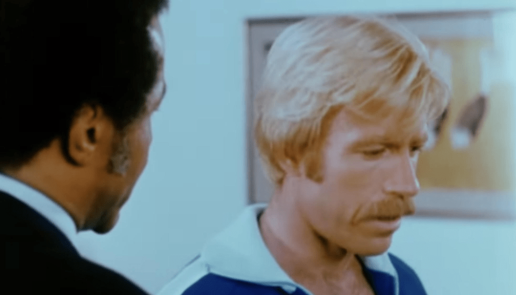 Maj. John T. Booker (Chuck Norris) once he returns to civilian life is not only a race car driver but teaches at a college and has a girlfriend he keeps forgetting about who shows up in one scene and drives him to school. After that you would be forgiven for not remembering her because not only is she never named but is never mentioned after he gets to work. Makes it easier to be okay with him bedding the movie’s love actual interest.