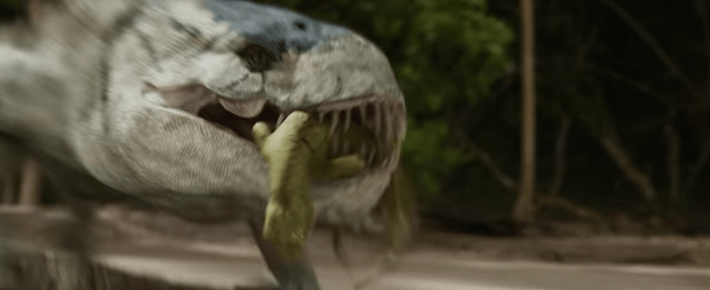 More monsters escape through a hole in the thermal layer of the trench. We get three megalodons, a squid, and aquatic dinosaurs. It makes for some cool moments, but they’ve been down there for millions of years and you’ve got to ask how do they still have legs? Legs would seem to be the most useless thing that far down. At least legs capable of walking on land yet here we are. And do not even consider why those dinosaurs have lungs capable of breathing air.