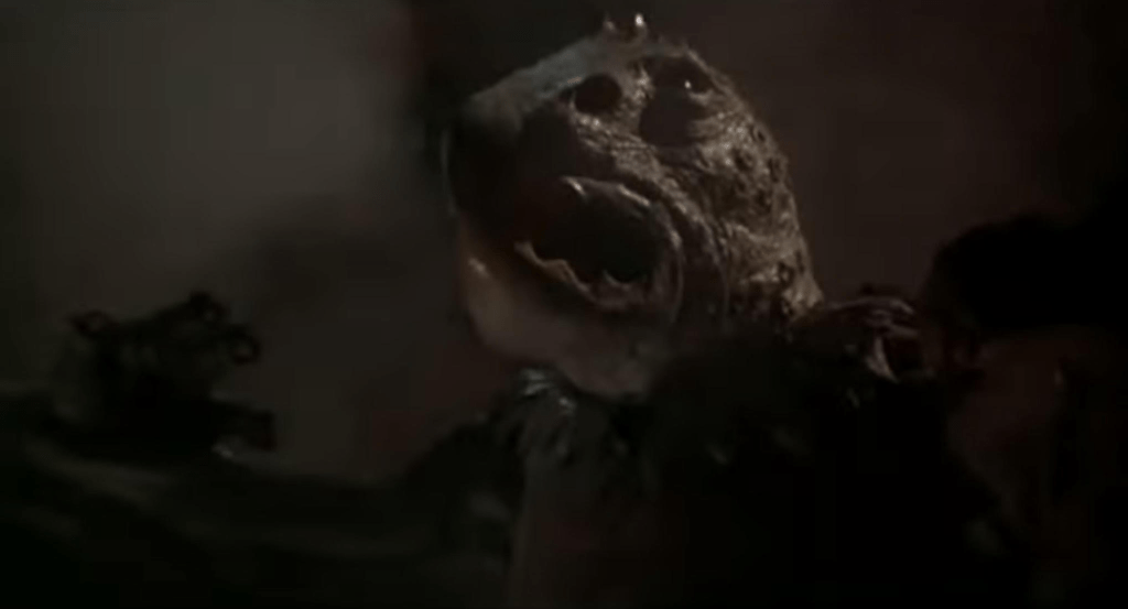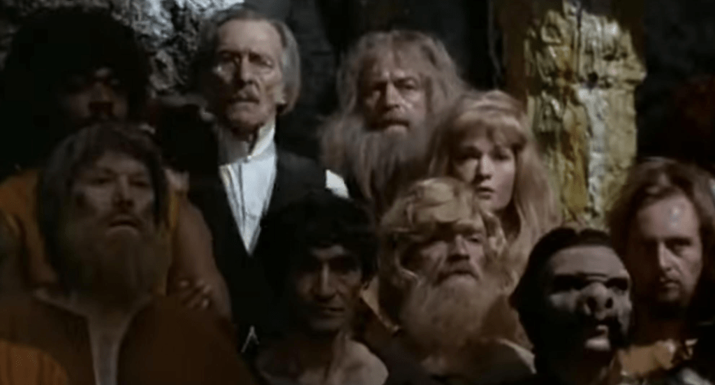 After stumbling into this new realm they run afoul of the local authorities who are a bird like kinda reptile thing with a Kermit the Frog style collar known as the Mahar who control the ape-like Sagoths. And Innes meets the local hot princess named Dia (Carolyn Munro) and there is an attraction most likely because Innes uses soap. In very short order Innes and Perry manage to unite multiple tribes that have never liked each other and raise an army to go against the evil creature thing overlords. How did they do this? Because they’re Doug McClure and Grand Moff Tarkin.