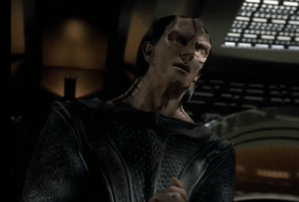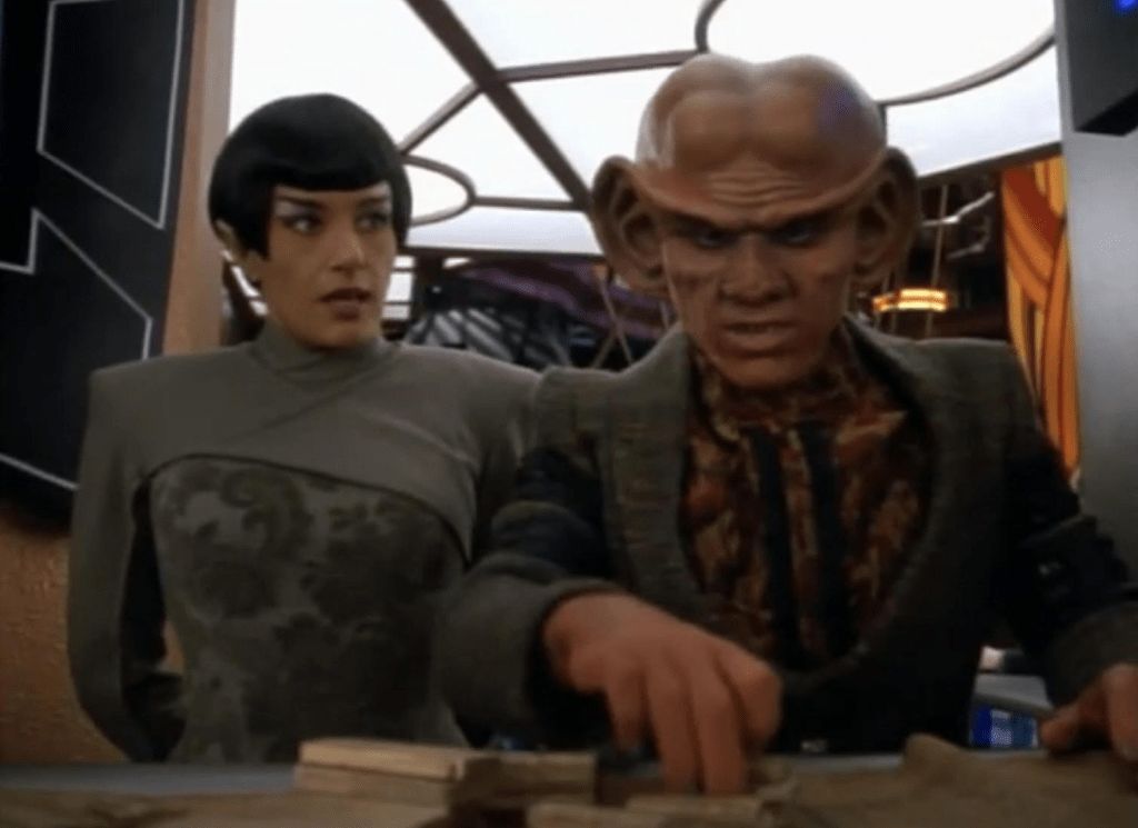 There’s a subplot involving the always shady Quark (Armin Shimerman) and a Vulcan named Sakonna (Bertila Damas) whom I thought until writing this was played by Sean Young. It is the usual sexual harassment by Quark of any attractive female with a pulse while they seek something from him. Shimerman once again made this man that never took ‘No’ for an answer charming or at the minimum likeable. Their part is mostly unimportant here but matters in the next episode.