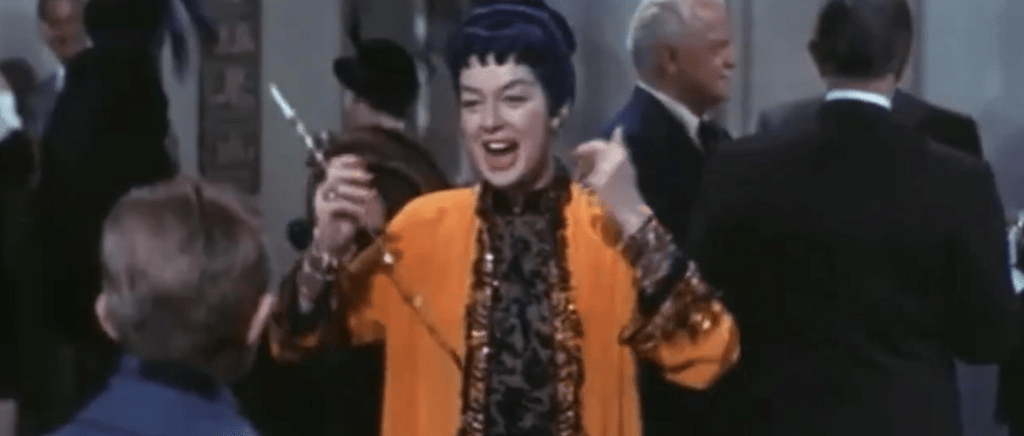 Auntie Mame is a culture clash comedy. It’s the free-spirited Mame Dennis (Rosalind Russell) versus the conservative leanings not only of her late brother but of Mr. Babcock (Fred Clark) who controls the purse strings while the retired actress provides a roof. “Life is a banquet and most poor suckers are starving to death!” is a quote by Auntie Mame spoken often by hers or paraphrased by others.