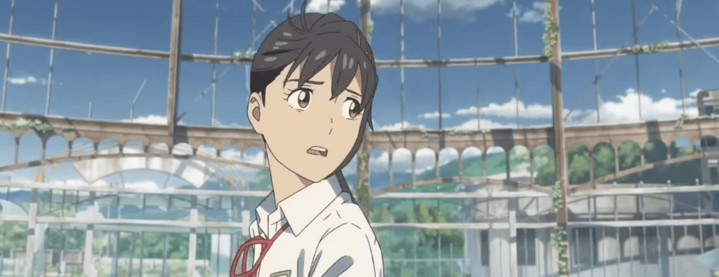 Another common trope we get here is that our title character must come to terms with the pain of the past. And it all connects to the chair that the guy she thinks cute was turned into. Yeah, he gets turned into a chair. I applaud writer/director Makoto Shinkai for some of the things he came up with to try to give a fresh spin on heavily used elements along with using the 2011 Tōhoku earthquake and tsunami as an influence.