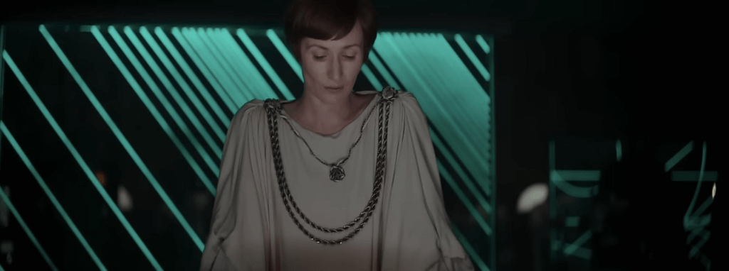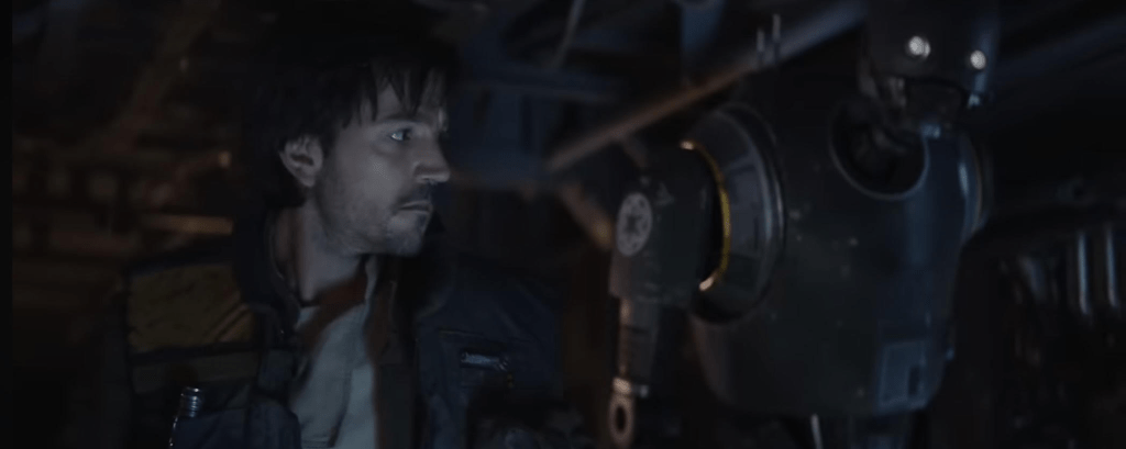 If there are opposing philosophies to be found in this it is between the approach of the Rebels and Saw Gerrera (Forest Whitaker). A week before A New Hope Mon Mothma (Genevieve O’Reilly) is stuck on using political and legal maneuvers to depose Palpatine while Saw is focused on conflict. Saw at the minimum understands that this is not a fight to be won in the courts or through formal rules of government. Heck everybody else realizes that blood needs to be shed but her. Incongruous with the later presentations of where Mon Mothma seems to understand what was going on.