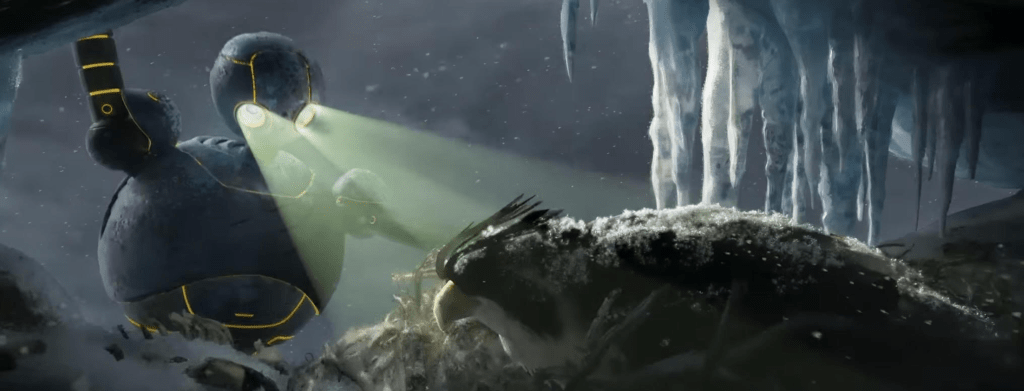 There’s a note of do the right thing even if others have not done the right thing to you. Towards the end of the film there’s a snowstorm that threatens the inhabitants of the island and Roz works to save all the animals who could die even though they have feared her. That mixes with mild themes of humanity that becoming separated from nature with technology. What glimpses we get shows this future society lives and dies by technology in preplanned communities and doesn’t even appear to go out into nature anymore. The world we see is cold and sterile and very predictable. That’s even highlighted in a video that we get to see.