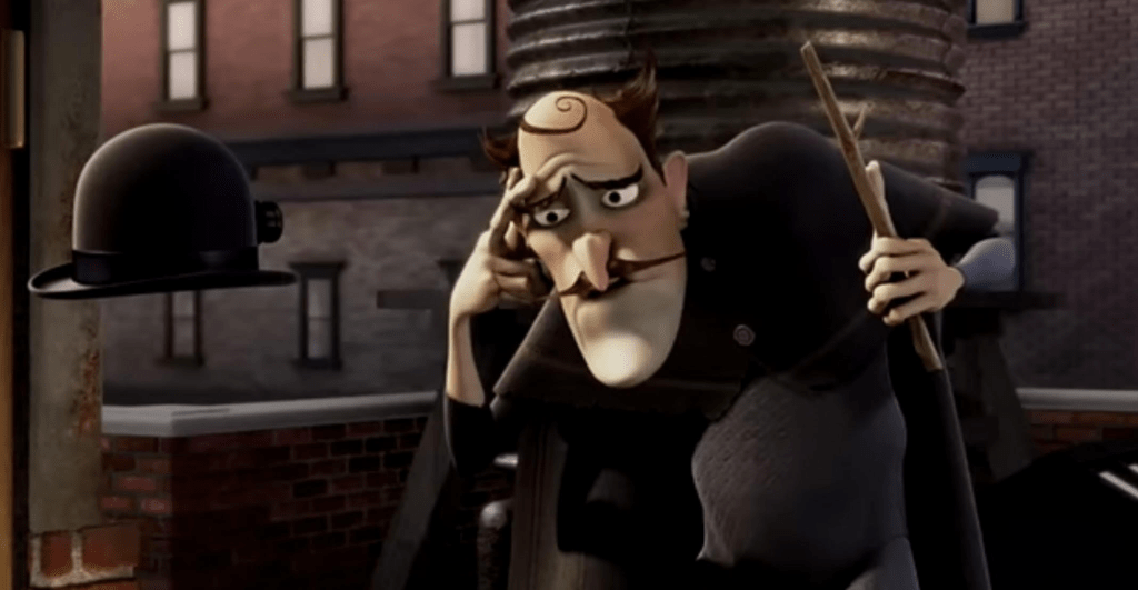 The secondary villain is generally referred to as Bowler Hat Guy with a name reveal coming down the line. He stole a time machine to ruin Lewis’s life. Why? Because his younger self of Mike “Goob” Yagoobian was so sleep deprived from Lewis’s random inventing that it ruined his life. Never does Lewis’s complete lack of consideration get viewed as wrong or mildly inconsiderate. Ruining a life for revenge purposes and altering time and space are bad but Lewis was an inconsiderate twat that broke the poor boy.