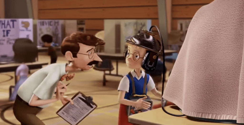 The main character of Lewis is a scientific genius orphan desperate for a home. He’s of the wacky and comedic invention type with his construction/materials used bordering on the implausible. That plays into how the future is portrayed. The technology we encounter is whimsical and silly like bubble travel or instant buildings. I like the whimsical technology but even the silliest part of me has trouble being okay with a fan, an old timey radio, and other stuff coming together for a memory viewing device.