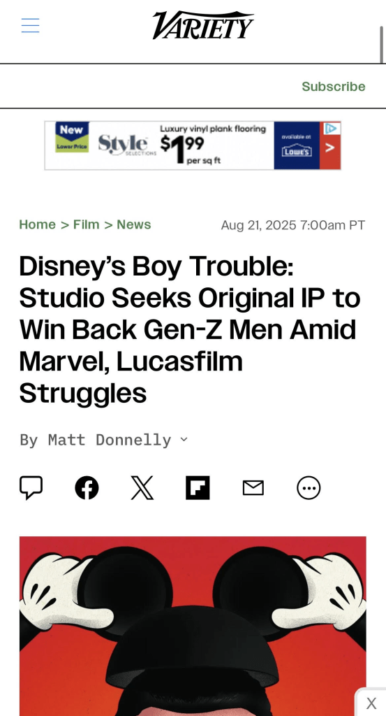 A recent story in the magazine Variety reported that Disney is now actively looking for new IPs to attract men or boys. Why? They own what could arguably be the two biggest in history yet THOSE are no longer the moneymakers they once were.