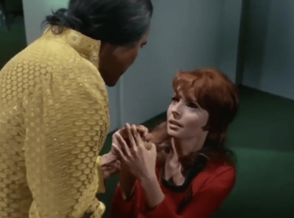 Historian McGivers at first does not know who she is dealing with despite Khan being one of the best-known tyrants of his era but she certainly looks DTF with him. Khan for his part does not turn her away but engages in some serious will breaking. It is classic emotional abuse compressed into a length of time that is friendly to a weekly series. Givers not going “That’s Khan” though might bring her eyesight or skills into question. It would kinda be like a history teacher not recognizing Hitler.