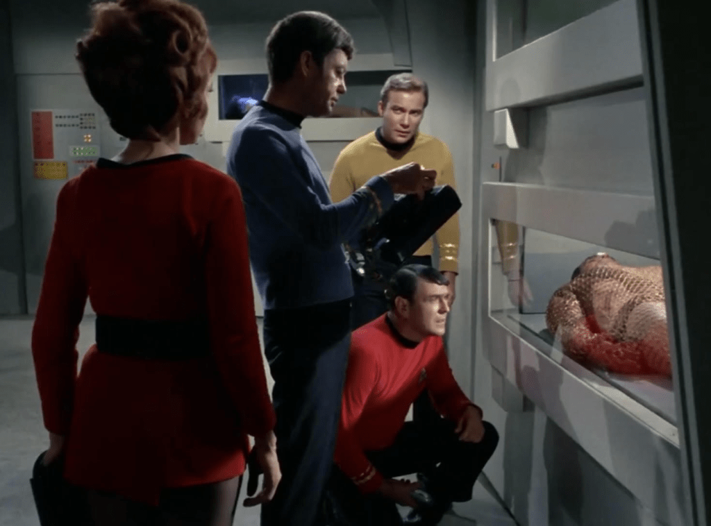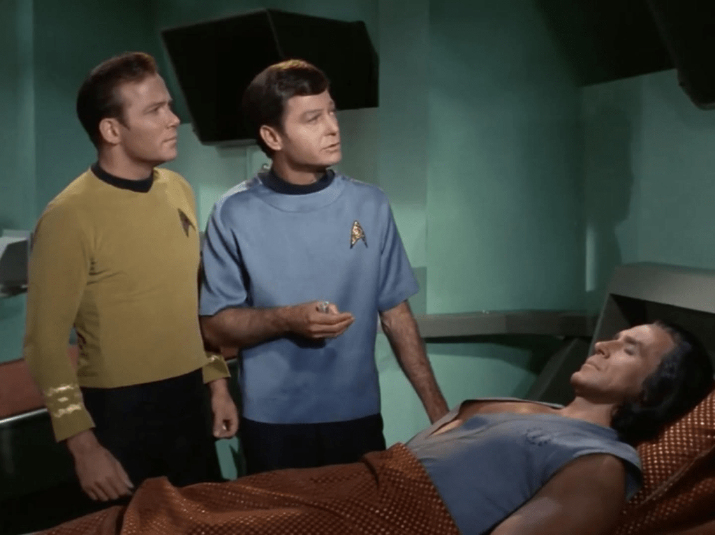 In a scene shortly after discovery McCoy (DeForest Kelley) demonstrates his characteristic wit and intelligence with a recovering Khan in the sickbay. In a bit of macabre humor while Khan has his hand on McCoy’s throat the doctor prescribes the best way to kill him. A perfect McCoy moment.