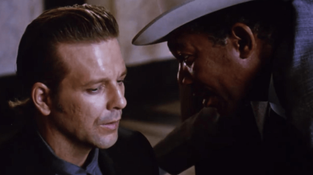 This is a revenge movie but it takes a while before revenge ever gets started in Johnny Handsome. The story is more about Johnny’s life and trying halfheartedly to get a fresh start. We see him as a loyal friend and complex soul looking for love as well as a new life. Then there is the question of who is getting revenge exactly in the movie. Is it Johnny or is it Lt. A.Z. Drones (Morgan Freeman) seeking to finally get the goods on Rafe Garrett (Lance Henriksen)? Walter Hill makes a good case for both.