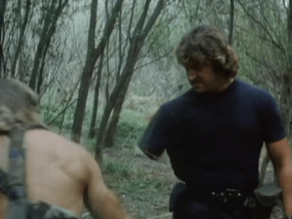 Our super tough guy Michael “Mike” Danton (Ted Prior) that’s taking on and taking out everybody that comes at him wears quite possibly the shortest of shorts that uncomfortably border on Daisy Dukes in this wannabe First Blood. He even uses the Rambo scream when firing a gun in the movie.