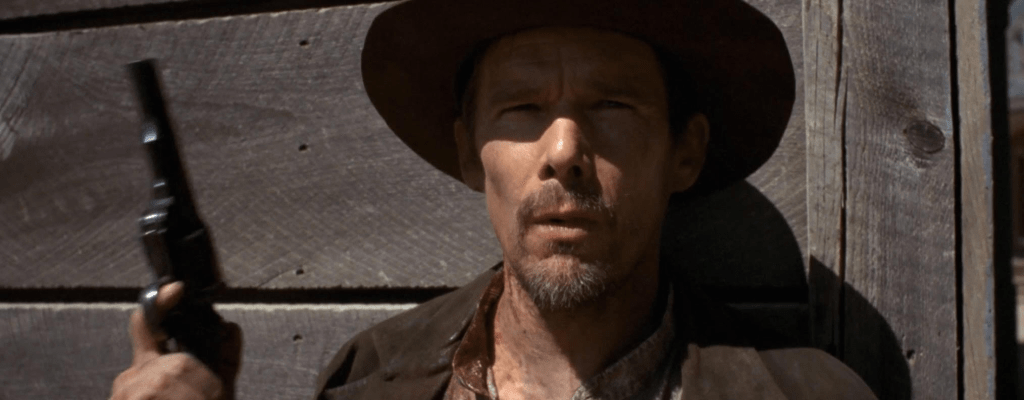 Ethan Hawke plays an Indian Wars veteran and drifter named Paul trying to flee to Mexico with his dog Abbie who cuts through the town of Denton which looks like it does not have much more than ten people with five of them in law enforcement. There are a pair of sisters, a shopkeeper, some guy who informed Paul that the shopkeeper was tending to his pigs, a bartender with no customers beyond local law enforcement, and that local law enforcement consisting of the town marshal and his four deputies.