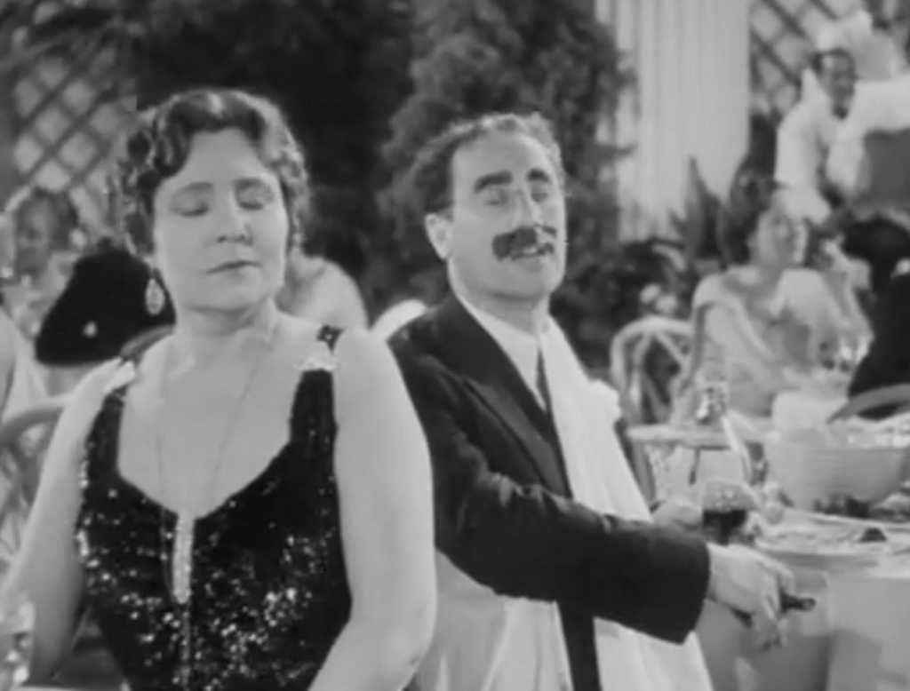 The movie goes in on absurdity. For me some of this appeared to be scripted for the general actors but the Marx Brothers appeared to be ad-libbing. Or it was a demonstration of their very practiced comedy banter. Either way their performance contrasted sharply with much of what we get elsewhere. I needed there to be a little more smoothness between their randomness and the more focused work of the larger cast. I don’t think though you could really script the humor of Groucho-as-Otis-B.-Driftwood and his harmless double entendres or comedic insults.