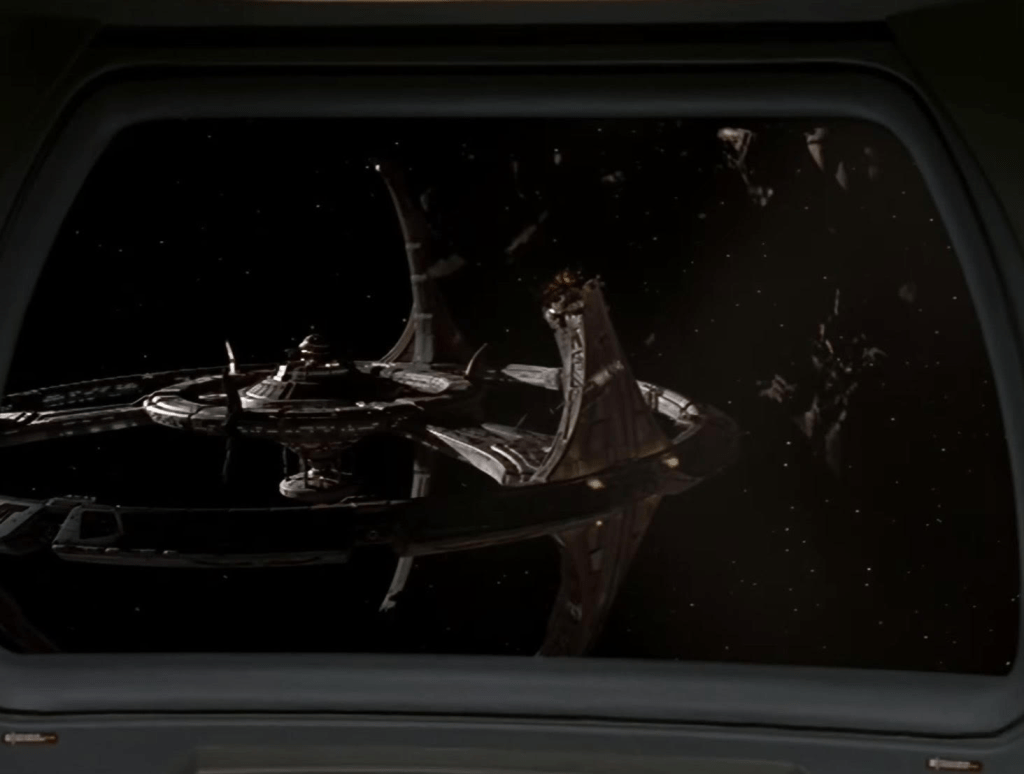 To the Death begins rather quietly with the Defiant returning from a mission as the crew trades playful banter. In contrast to its predecessors, DS9 was not a group of professional explorers but more of a workplace drama. The casualness of the first few minutes gives way to the shocking damage of DS9 (which was quickly repaired by next week’s episode). Half a docking pylon was missing and it was back quickly!