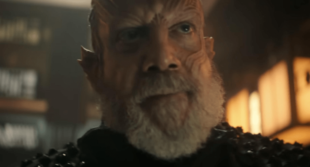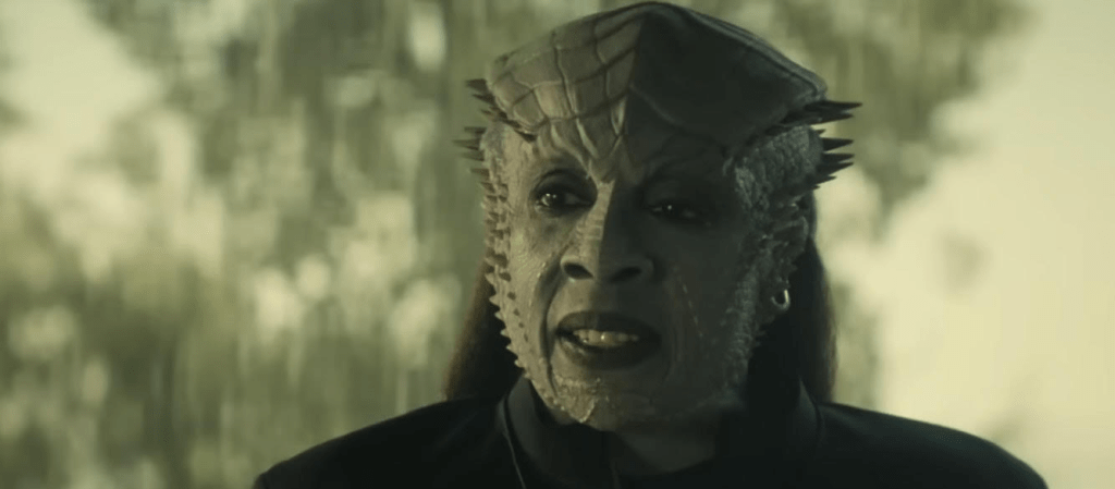 Paul Giamatti, one of the more hyped actors of the show, plays Klingon/Tellarite hybrid Nus Braka. He shows up here when Caleb sends out a random message to his mom in another blind fire effort to find here. This leads Nus Braka who looks to have been conveniently nearby right to him and reveals he is still angry and seeking revenge against Chancellor Nahla Ake (Holly Hunter) who avoids sitting in the captain’s chair with authority but chooses instead to sit curled up and barefoot like somebody about to hear/say some juicy gossip.