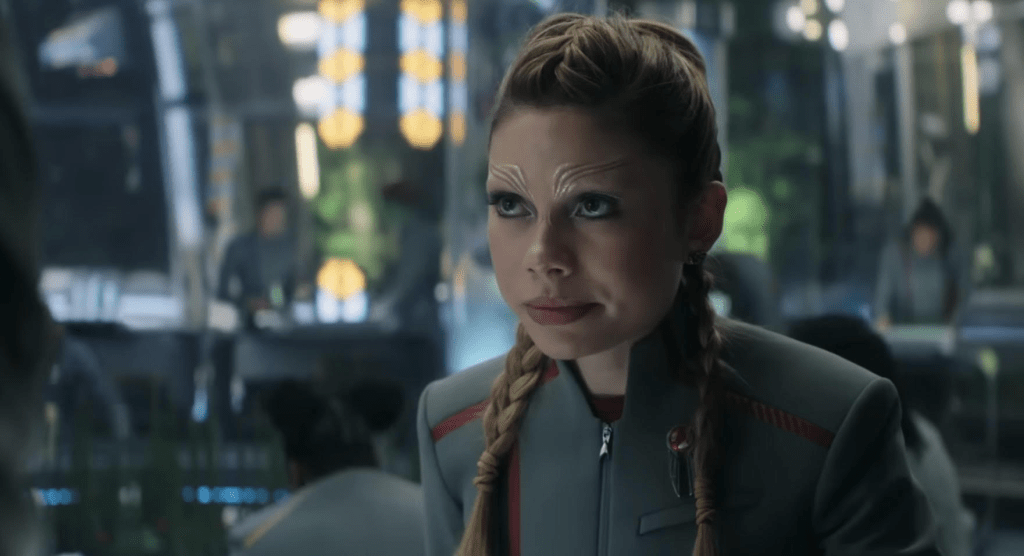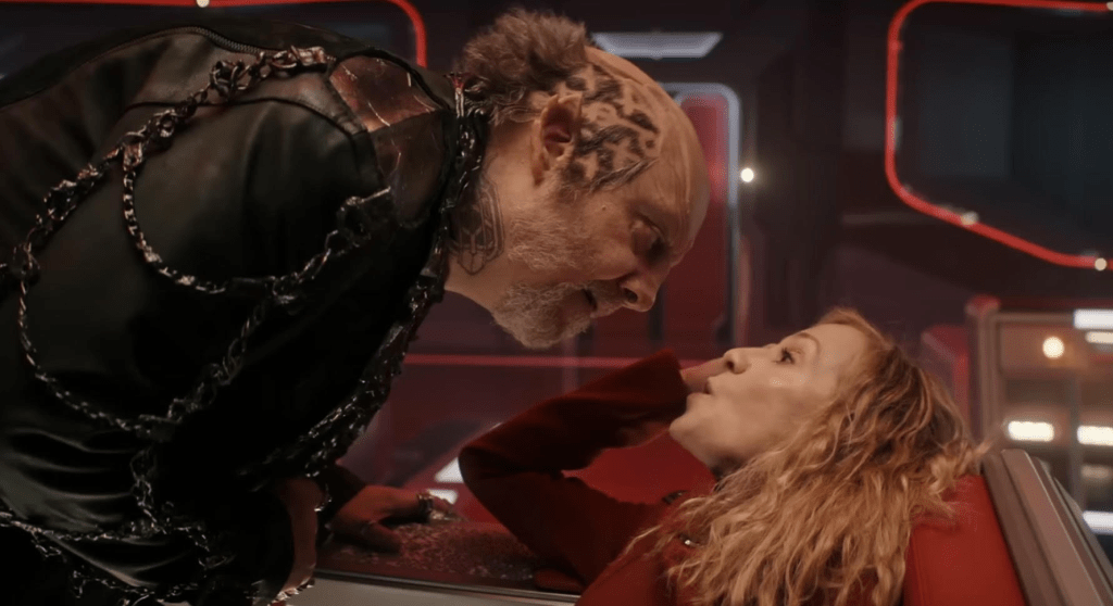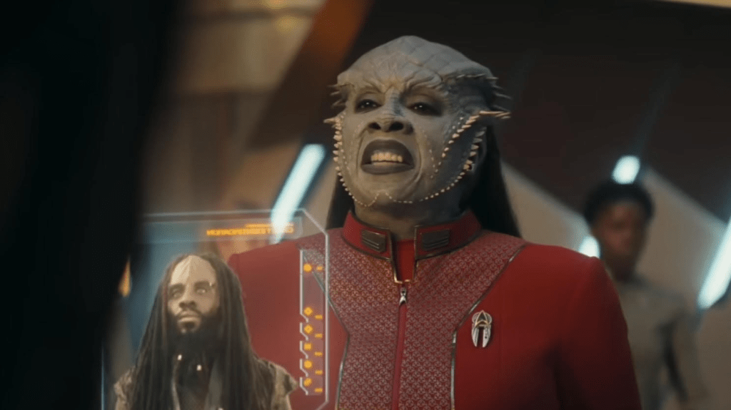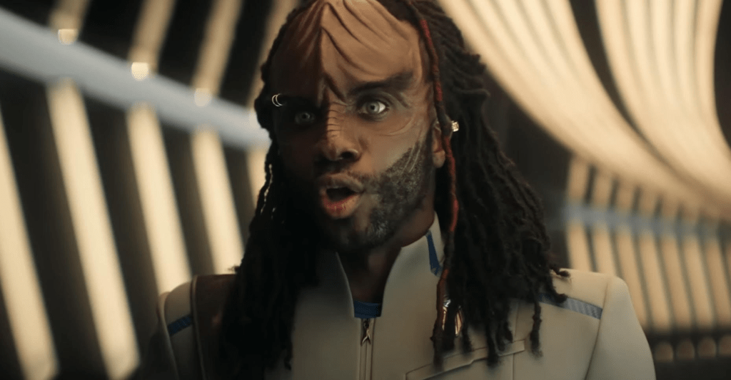 There is a full-blooded Klingon named Jay-Den Kraag (Karim Diané). Jayden. His personality is modeled more on Worf (Michael Dorn), son of Mogh, than on Martok (J.G. Hertzler), son of Urthog. Serious to the point of being a pale imitation of Dorn’s performance. He lacks the gregariousness of the off-duty Klingons when we generally saw them post-TOS but acts more like the on duty ones (example Kruge as played by Christopher Lloyd).