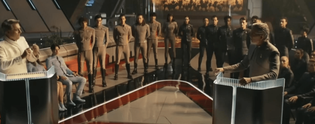 The first scene with the Betazoids should be a welcoming scene and does look like it will be with Admiral Vance (Oded Fehr) and the Betazed president exchanging pleasantries at podiums. What it turns into is a debate/negotiation with an audience. Gone is the dinner party scene all the shows had where casual discussion would occur setting up the scenario with maybe a scene of negotiation.