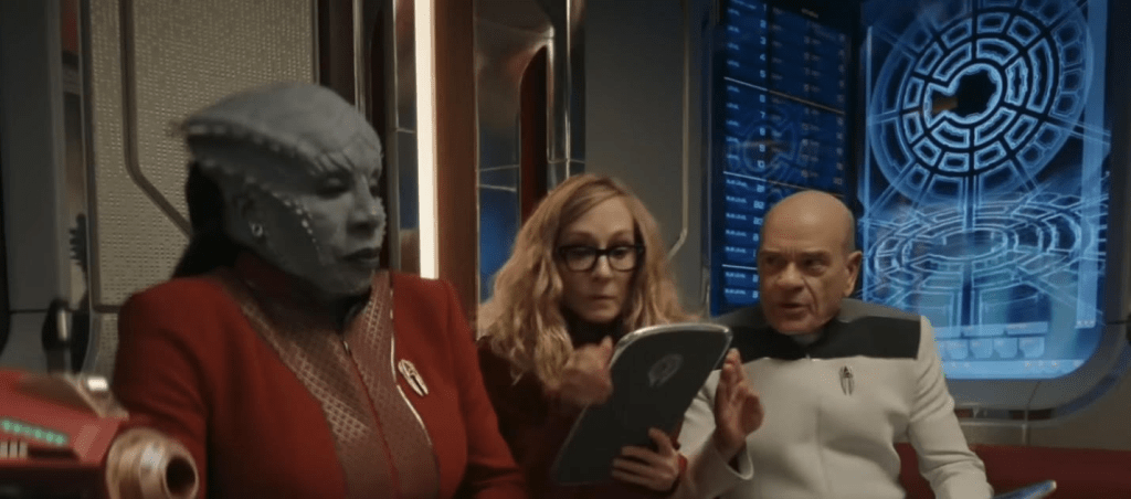 I’m still feeling bad for Robert Ricardo. He’s there for humor rather than character development or to be a character as well as acting as a reminder that this is a Star Trek show. Lura Thok and Chancellor Ake (Holly Hunter) have a few moments with him and try to back away each time like they were just corner by somebody unlikeable or unpopular. This is what the character and actor have been reduced to being in. There is a callback to Beyond with The Doctor performing an operatic duet with an alien seen in that film. That instance is less a reminder this is Trek and more just digging into the species well.