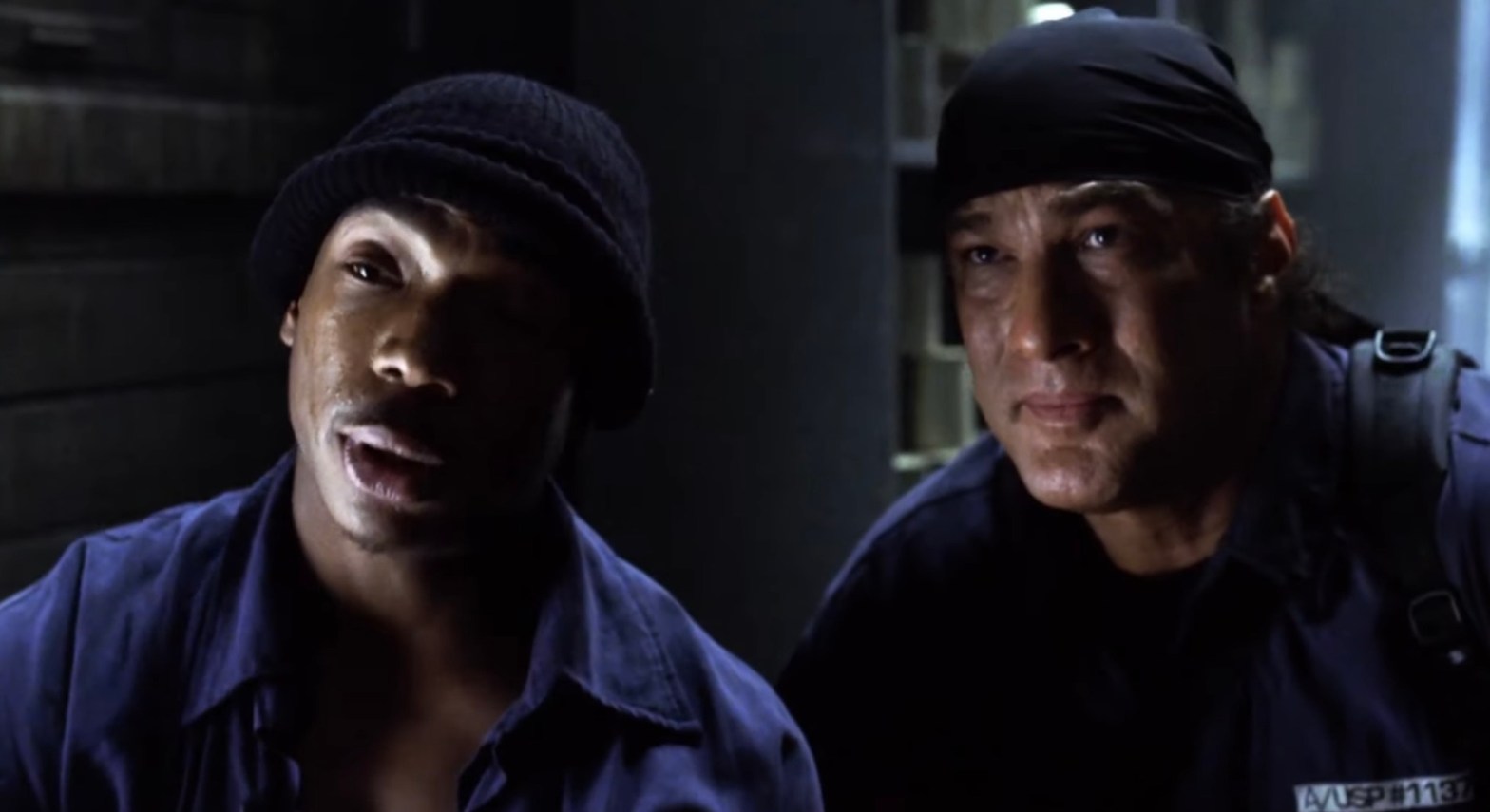 Seagal by this point had crossed the line into being a physically implausible action star. Not as heavy as he is now but the loose orange jumpsuit does not hide the belly hinted at by the extra chin or own sees in a group shot. His now trademark waddle and the use of stunt doubles, especially in a skydiving scene, does little to help.