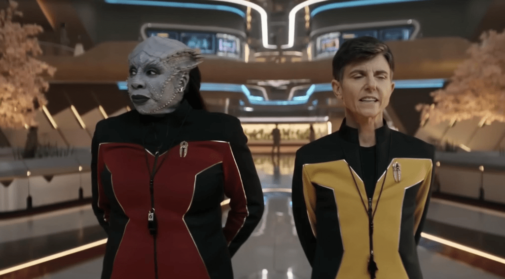 Gina Yashere as Lura Thok spends much of her time acting like a bad cross between R Lee Ermy in Full Metal Jacket and a parody of a Klingon. The lines uttered are shouted in a mix of angry romantic with her revealed girlfriend Jett Reno (Tig Notaro) and a superficial warrior aesthetic. The two being supporting characters get a good amount of time yet have no chemistry.