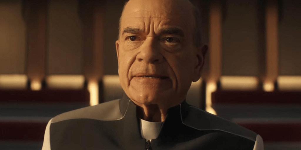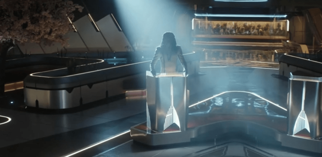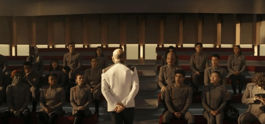 The first significant scene of Vox in Excelso involves The Doctor (Robert Picardo) teaching a debate class and using the phrase “Chicken sh!t” towards a student with the excuse he can because he is several centuries old. That seems like flimsy reason. Or a very modern one in a fictional world that was once aspirational. We also get the first inklings of Jay-Den (Karim Diané) with his very perfect Klingon teeth having panic attacks over public speaking.