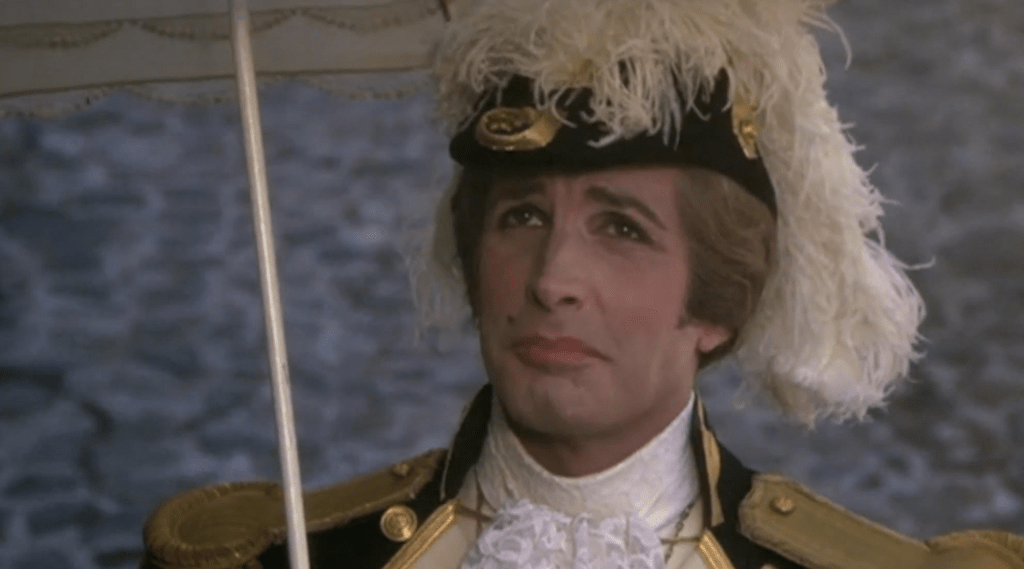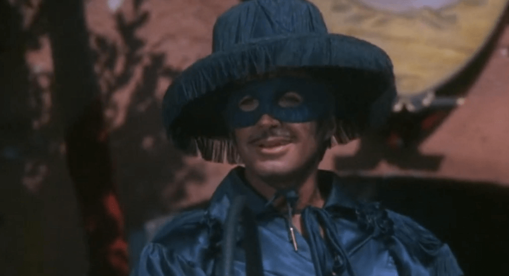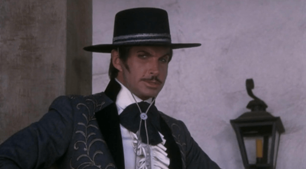 George Hamilton pulls double duty in this. Not only is he the film’s first Zorro Don Diego de la Vega but portrays Diego’s twin Ramón now going by the name of Bunny Wigglesworth after having spent time in the British navy at their late father’s behest to become more manly and fills in while Diego’s injured leg heals. Hamilton plays his Bunny Wigglesworth very flamboyant and over the top. If anything, it mocks general stereotypes and even gets a bit of a joke in on perceptions of the Navy.