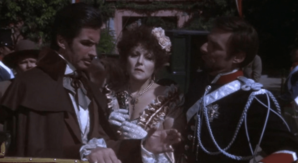 Present is a lot of subtitle sexual humor along with the obvious kind. Florinda (Brenda Vaccaro), wife of the movie’s villain Captain Esteban (Ron Leibman), is undersexed and completely uninterested in her husband. When Zorro unsheathes his sword in one scene she won’t hold the scabbard for her husband, but is gladly willing to hold the scabbard for others.
