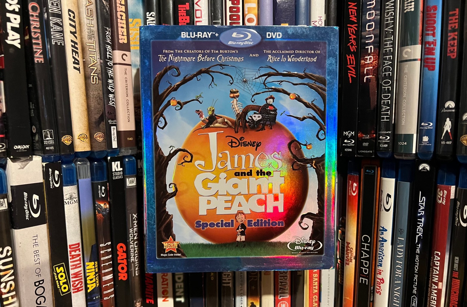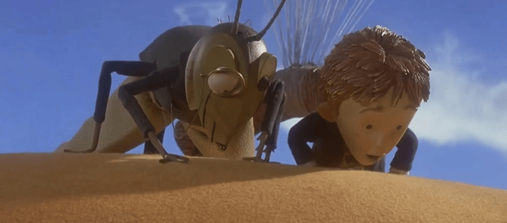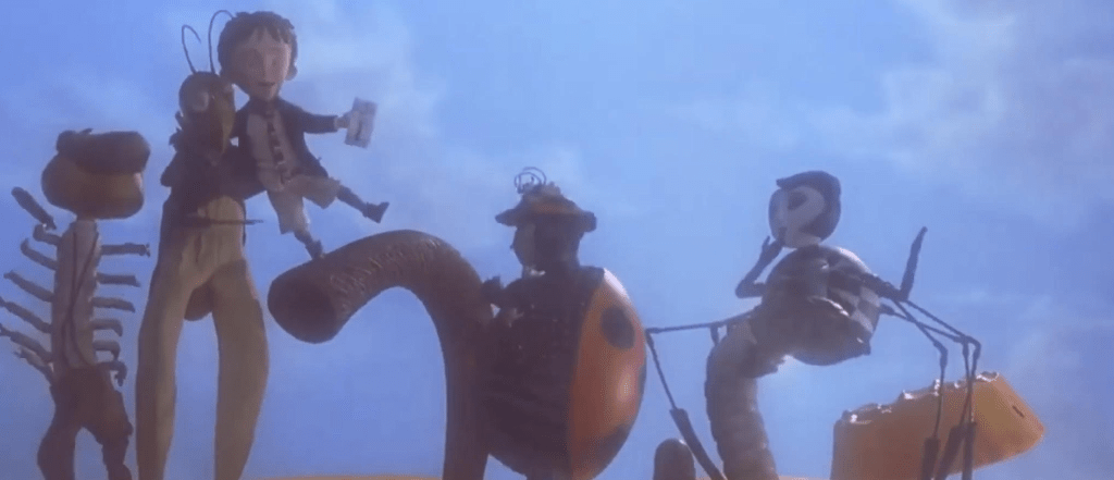 Though it has a dark fairytale edge to it in the opener, James and the Giant Peach takes a much more fanciful turn once you get to the stop motion animation which occurs in a way that traditional 2-D animation could never accomplish. It primes your mind to accept things that it otherwise could or would not. The designs for the characters look reminiscent of wooden marionettes.