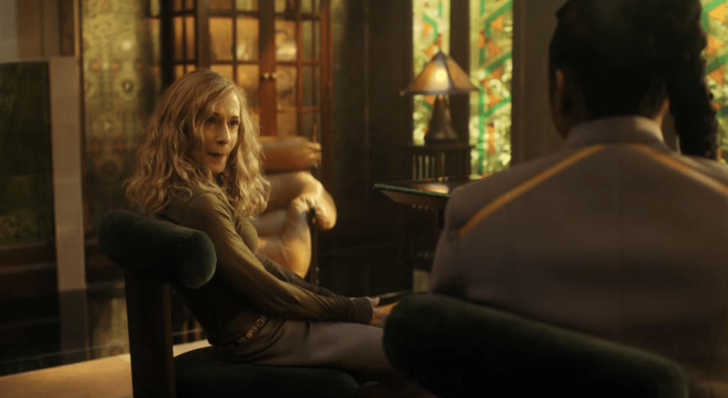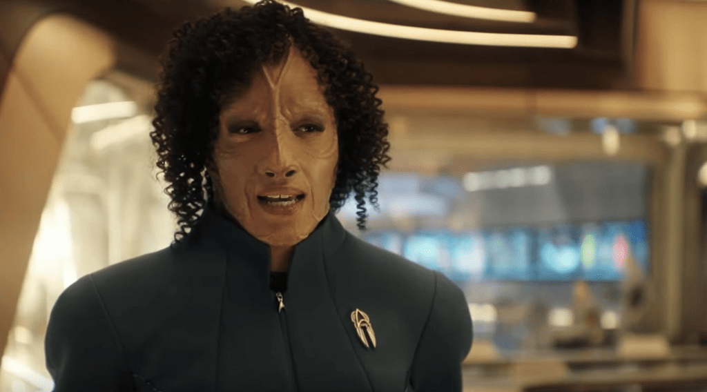 Tawny Newsome of Lower Decks fame shows up as Professor Illa Dax in another member berry pluck for this show to use. Her character either mimics the appearance the first Trill we saw in the TNG episode The Host or as indicated with the spots that were used from Terry Farrell onward is a Cardassian/Trill hybrid because we do not have enough hybrids appearing on this show.