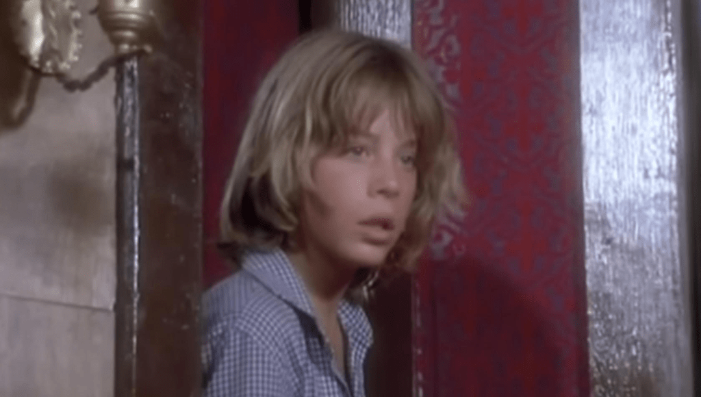 As a person, Van Cleef was never a bulky guy, but the costuming choices of the film make him look like a stick figure. He still had the ‘go f-yourself’ look and badass delivery but believing him as a tough guy is hard when he disappears in the darkness of the doorway behind him or when mildly blocked by any object or character. The then teen heartthrob (and costar) Leif Garrett as the young Johnny has a bigger build!