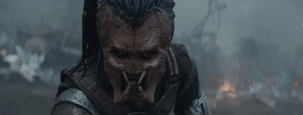 Badlands opens in a dark cave in a battle that reminds me of AVP: Requiem. Not because it’s a battle like one from that but because it’s so hard to see! An important thing with showing any battle is allowing the audience to see enough of what is going on while also maintaining whatever aesthetic the director is aiming for. With the shadows and heavy CGI, you have trouble following the action. This is a training scene really for Dek’s first hunt so he can get his active camouflage (cloak). We do not need a deeper understanding of Predator culture! Sometimes less is more because what the very can create in their head is better than anything concrete authored by a writer.