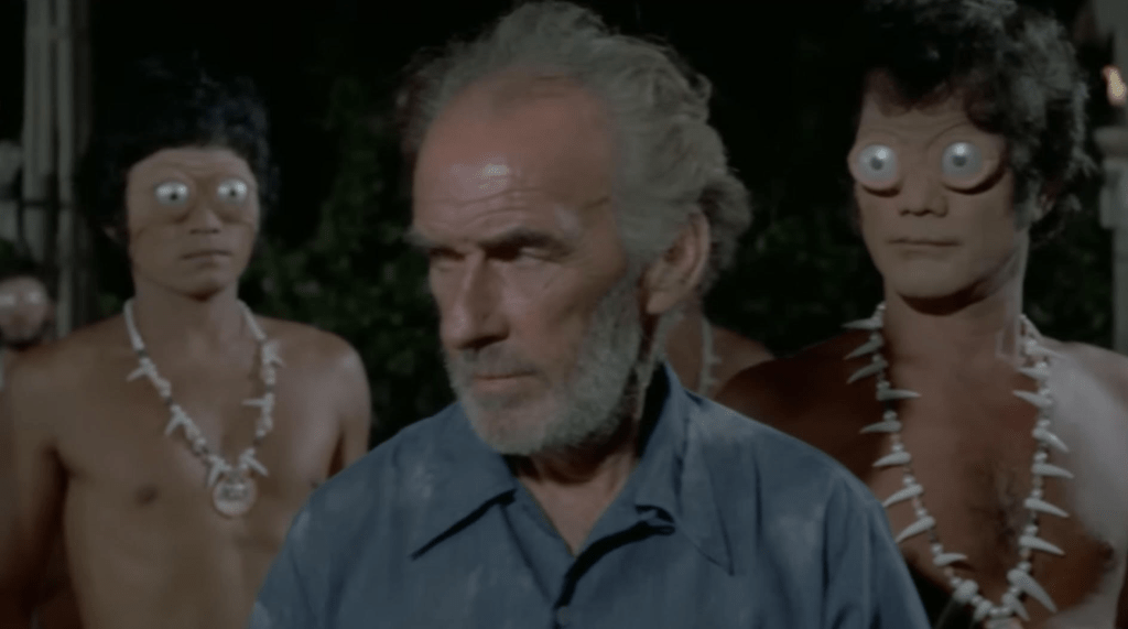 I watch this thing from start to finish and am completely mystified how Atlantis fits into all this. You could kind of take the featured tribe as being connected to Atlantis, but they’re also extremely inbred maybe though nothing really says they are. All but two of the members of the tribe have these weird eyes that I’m sure the prosthetics to used to accomplish blinded the people hired to wear them which may have been a blessing given how silly they look.