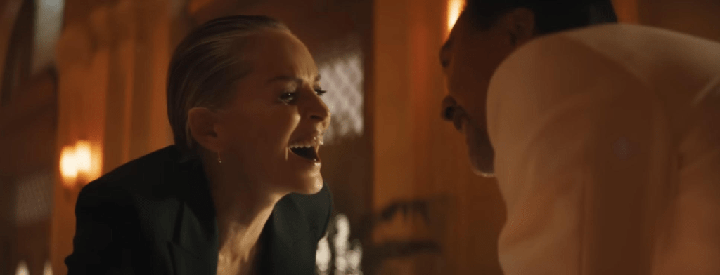 Problems occur because after a bad time in an arcade Hutch hands out a punishment to a guard that smacked the back of his daughter’s head. This might be the only action movie you see a guy get hit with a claw from a claw machine. Things are settled with understanding father Wyatt Martin (John Ortiz) who also happens to be the town boss. Unfortunately Sheriff Abel (Colin Hanks) cannot let it go and brings out the complete animal in Hutch. From there, things spiral out of control before we get to the real head of everything-Lendina played by Sharon Stone.