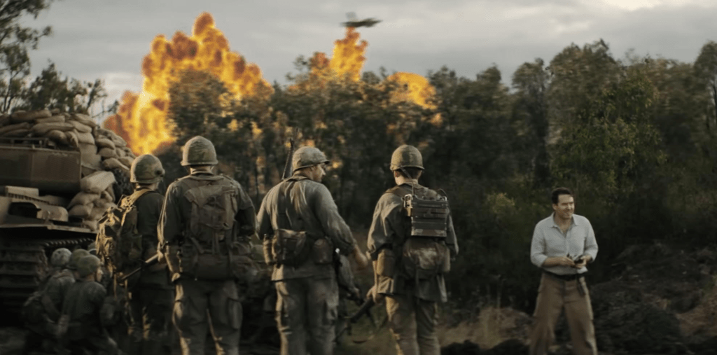 My first concern was it looked a little too clean and modern. Filming on digital over film stock takes away from any era even if digital does make special effects easier. There are moments of obvious CGI used to add more people, change the background, and the obvious addition of CGI dinos. That and the people look like they just stepped out of the present. It doesn’t help that Jeremy Piven has a very noticeable die job for his beard and facial hair. Where do you get Just for Men in the jungles of ‘Nam in ‘68?!