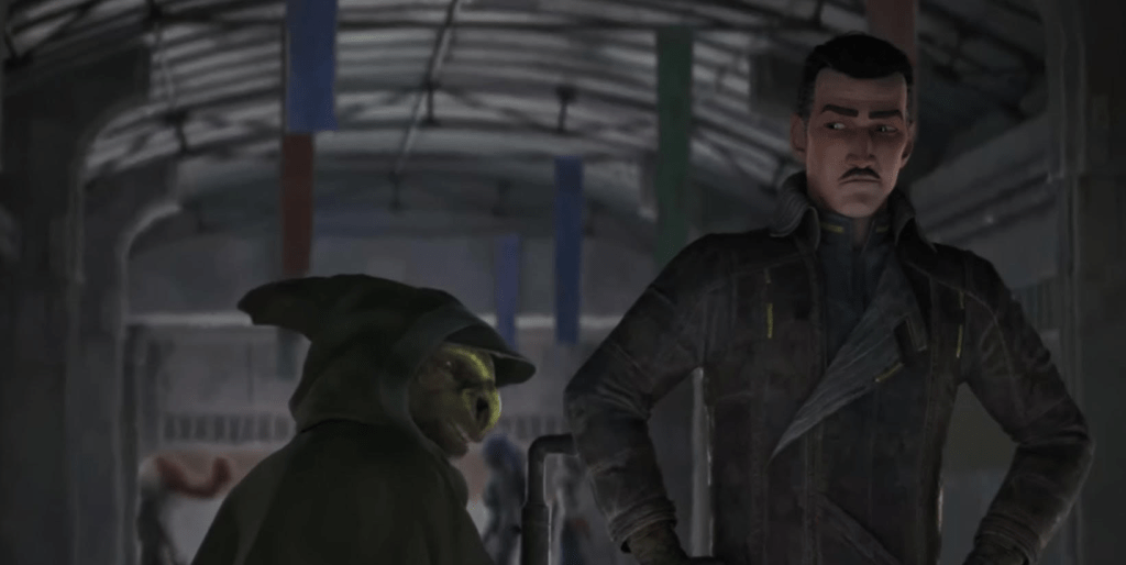 The other is to have a suspicious (to a cop) talk with Eeko-Dio-Daki who pops on over to the game. All their talk does is let Lawson know his investigation will take him to places he is unprepared for. This Jedi master does more to wet Lawson’s appetite than he does to warn him away. As a scene it expands on nothing other than to show Lawson prioritizes work over family and let us know his estranged wife works for the Empire.