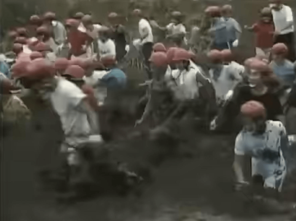 The footage used came from a Japanese series called Takeshi’s Castle. It was a competitive game show where contestants fought through a castle to get its ruler. It wasn’t a trivia contest but rather one physical challenge after another. They had names like Log Drop, Wall Bangers, Dope on a Rope, Rotating Surfboard of Death, and Sinkers and Floaters.